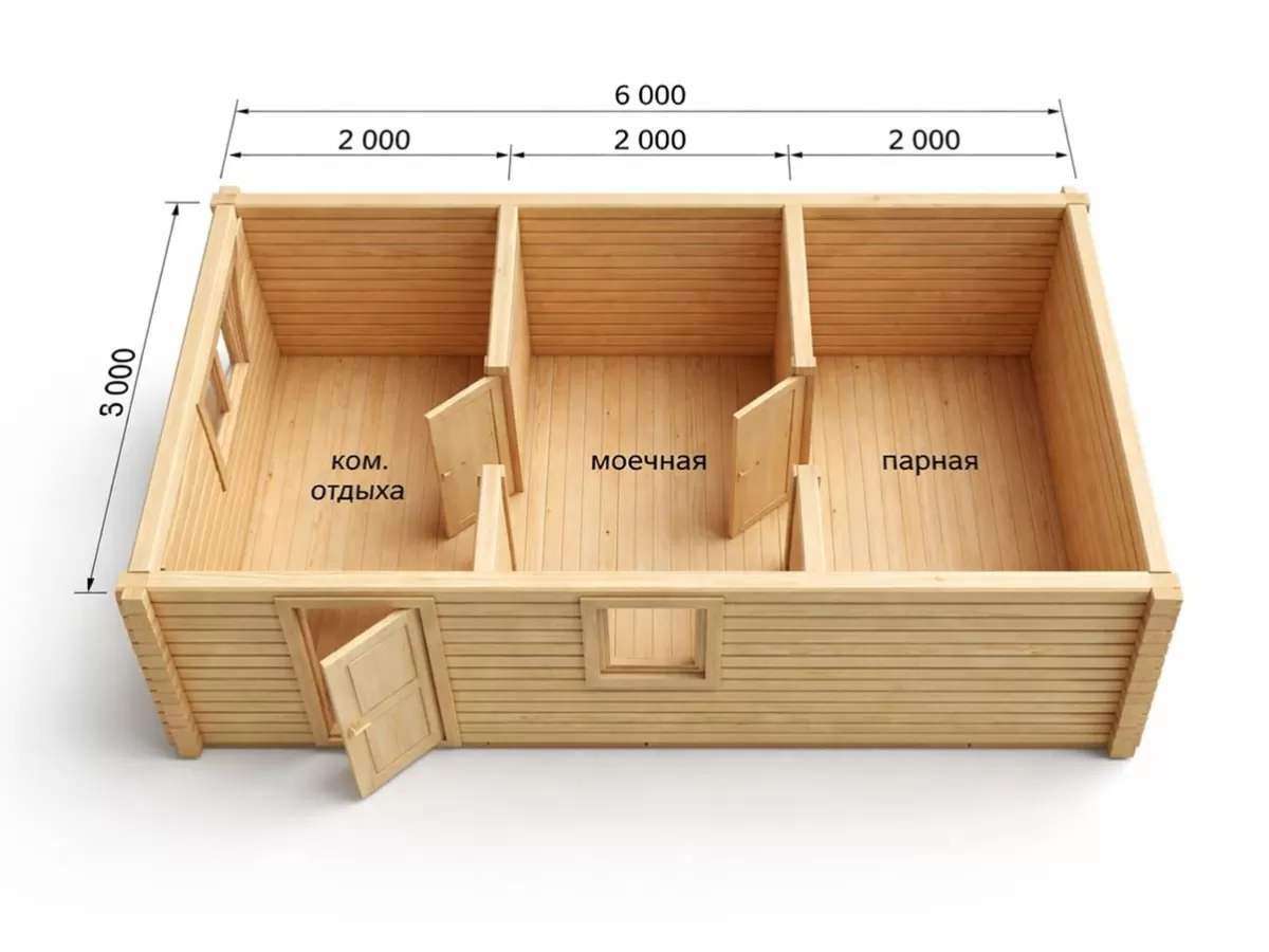 Такой размер позволяет разместить внутри три отдельных помещения: парную, моечное отделение и небольшую комнату отдыха, сохранив при этом разумную площадь застройки и удобство планировки.